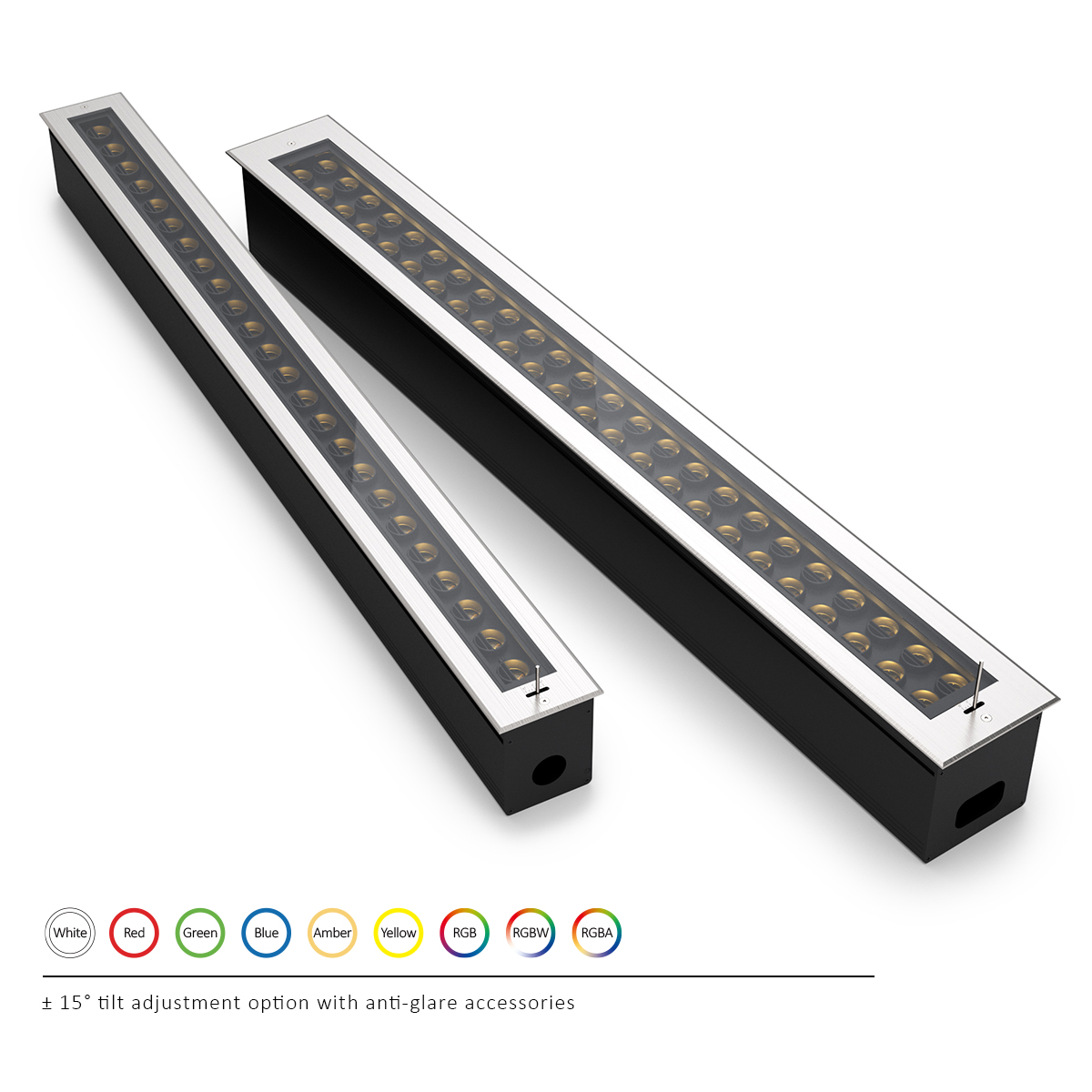 A high output linear inground that combines technology and performance in a stylish linear form factor with a ± 15° tilt adjustment. Packed with features including visual comfort and thermal management technologies. Available in a range of lengths,enables the luminaire to be installed in multiple orientations including continuous linear. Available in white, colour changing and tunable white light engines. -